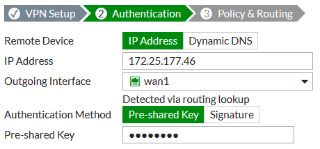 1.2 => ในขั้นตอน “Authentication”, ตั้งค่า “IP Address” เป็น Public IP address ของ Branch FortiGate (ในตัวอย่าง, 172.25.177.46)