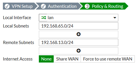 2.3 => ในขั้นตอน “Policy & Routing”, ให้ตั้งค่า “Local Interface” เป็น Lan, ตัวช่วยสร้าง (Wizard) จะเพิ่ม Local subnet ในเครื่องโดยอัตโนมัติ ตั้งค่า “Remote Subnets” เป็น Subnet ของ HQ network (ในตัวอย่าง, 192.168.65.0/24)
